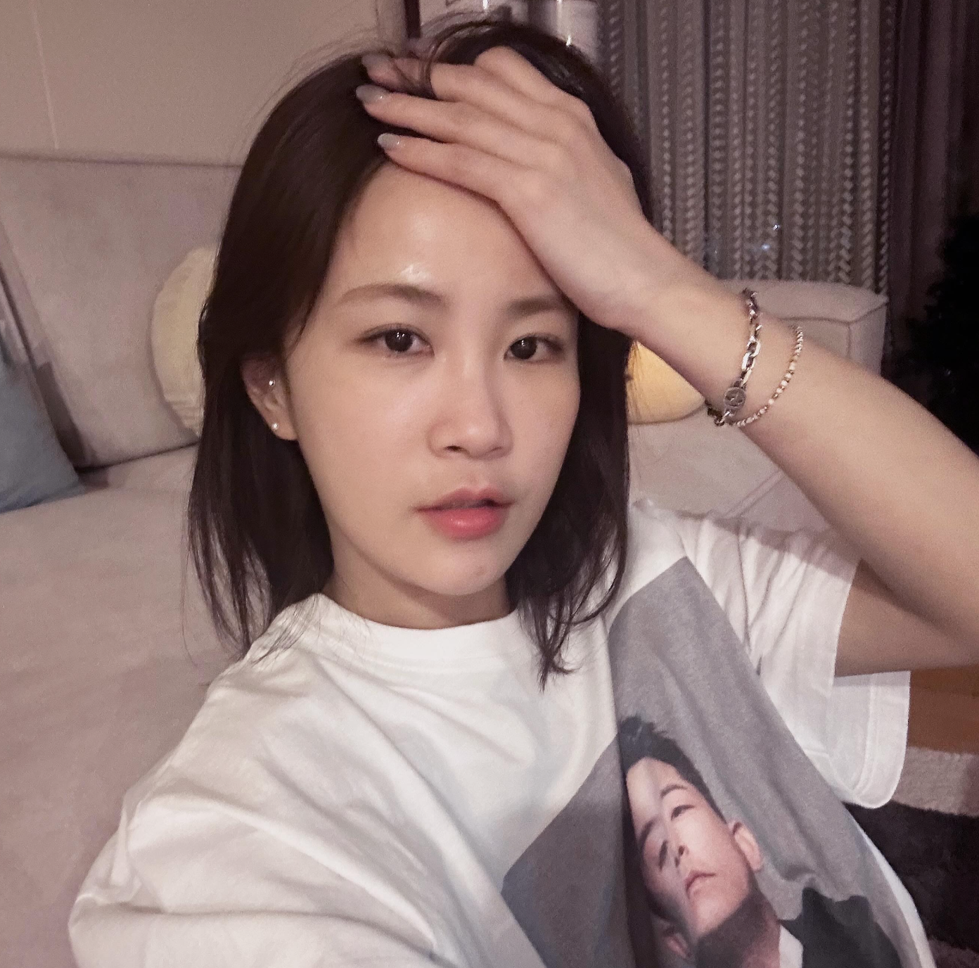 사진 속 김지민은 홀로 소파에 기대 포즈를 취하고 있는 모습이었고 화장기 없는 수수한 미모와 동시에 눈길을 끌었던 것은 입고 있던 티셔츠였습니다.