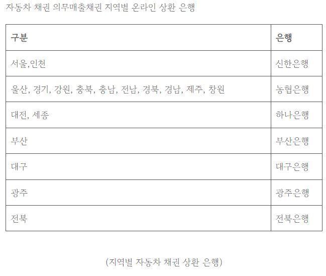 결론을 말씀드리면 지역마다 은행이 정해져 있고 아래와 같습니다.